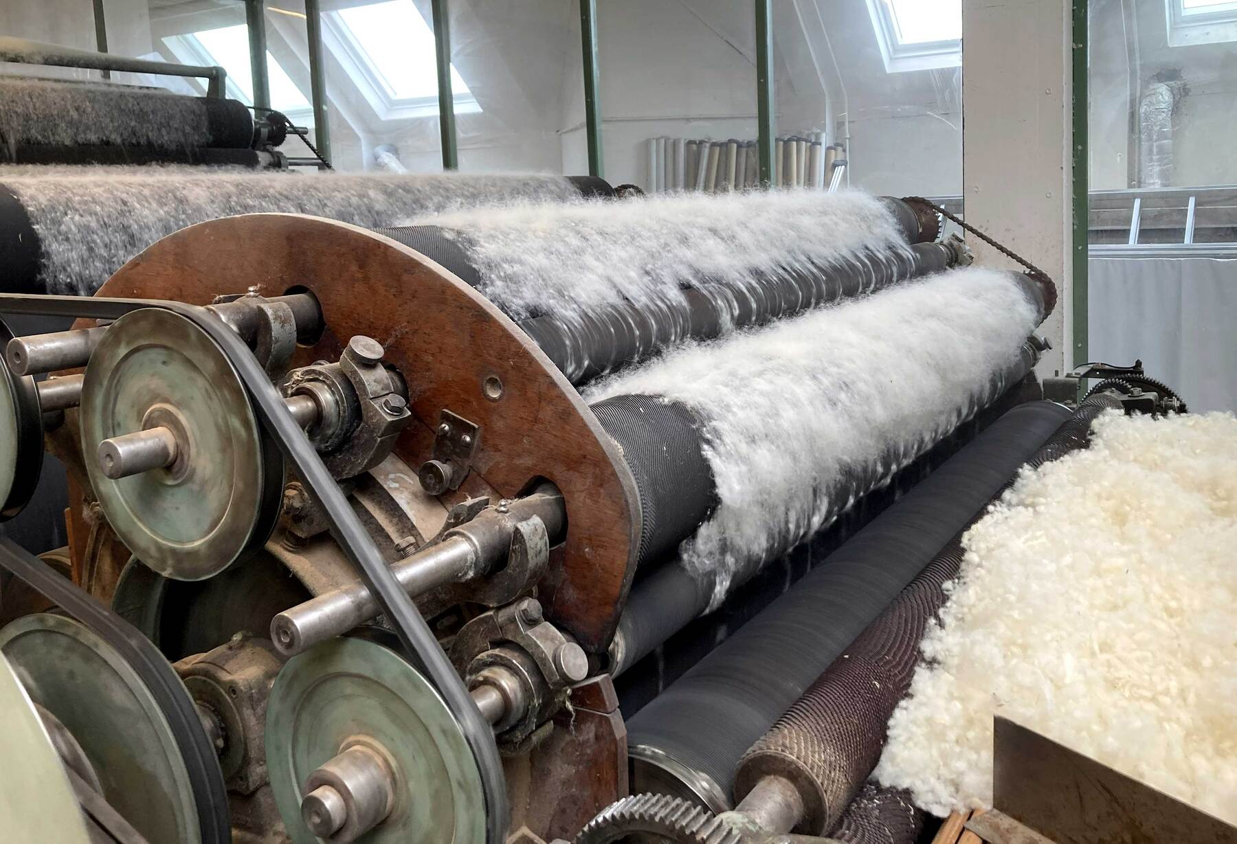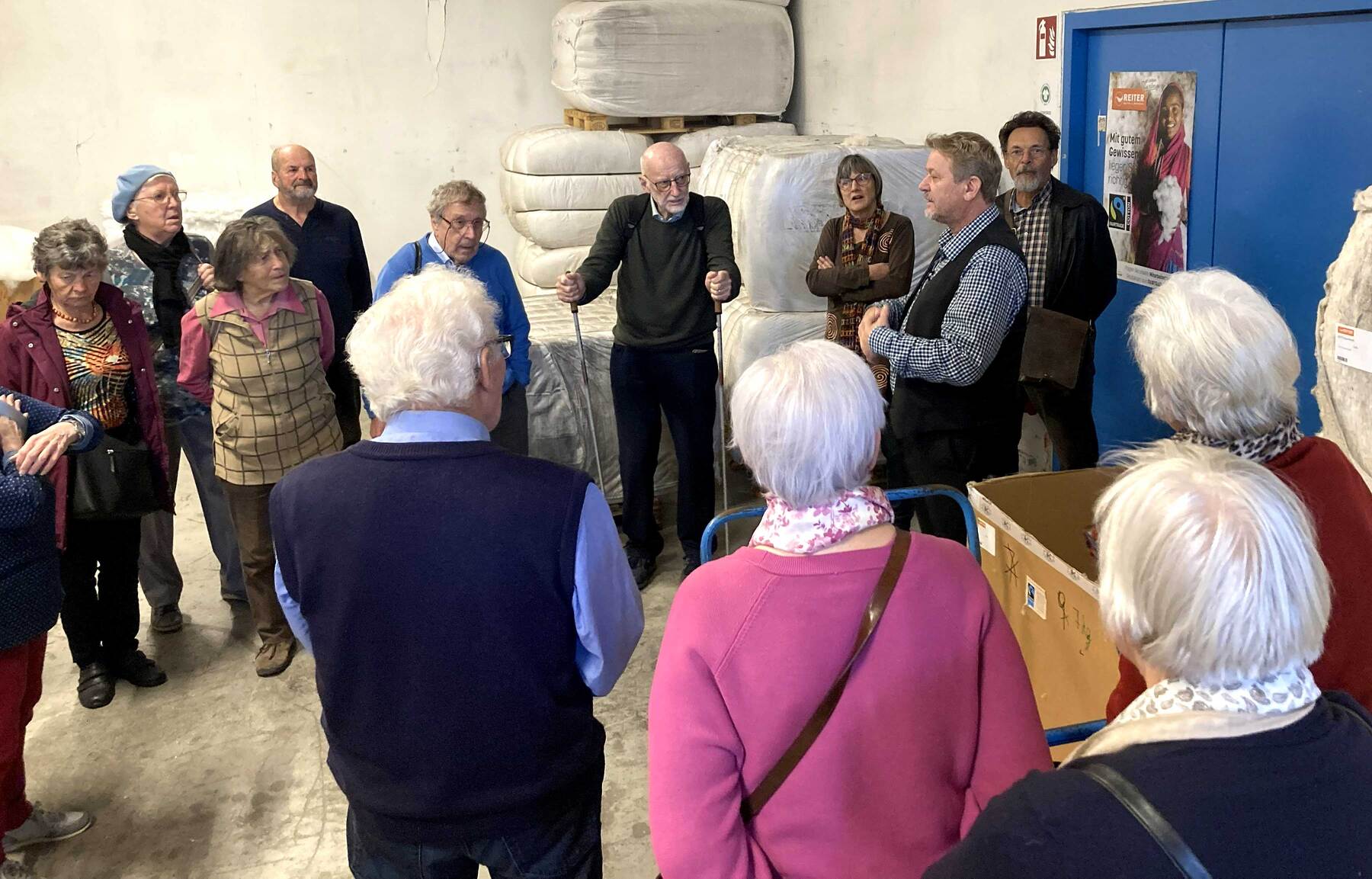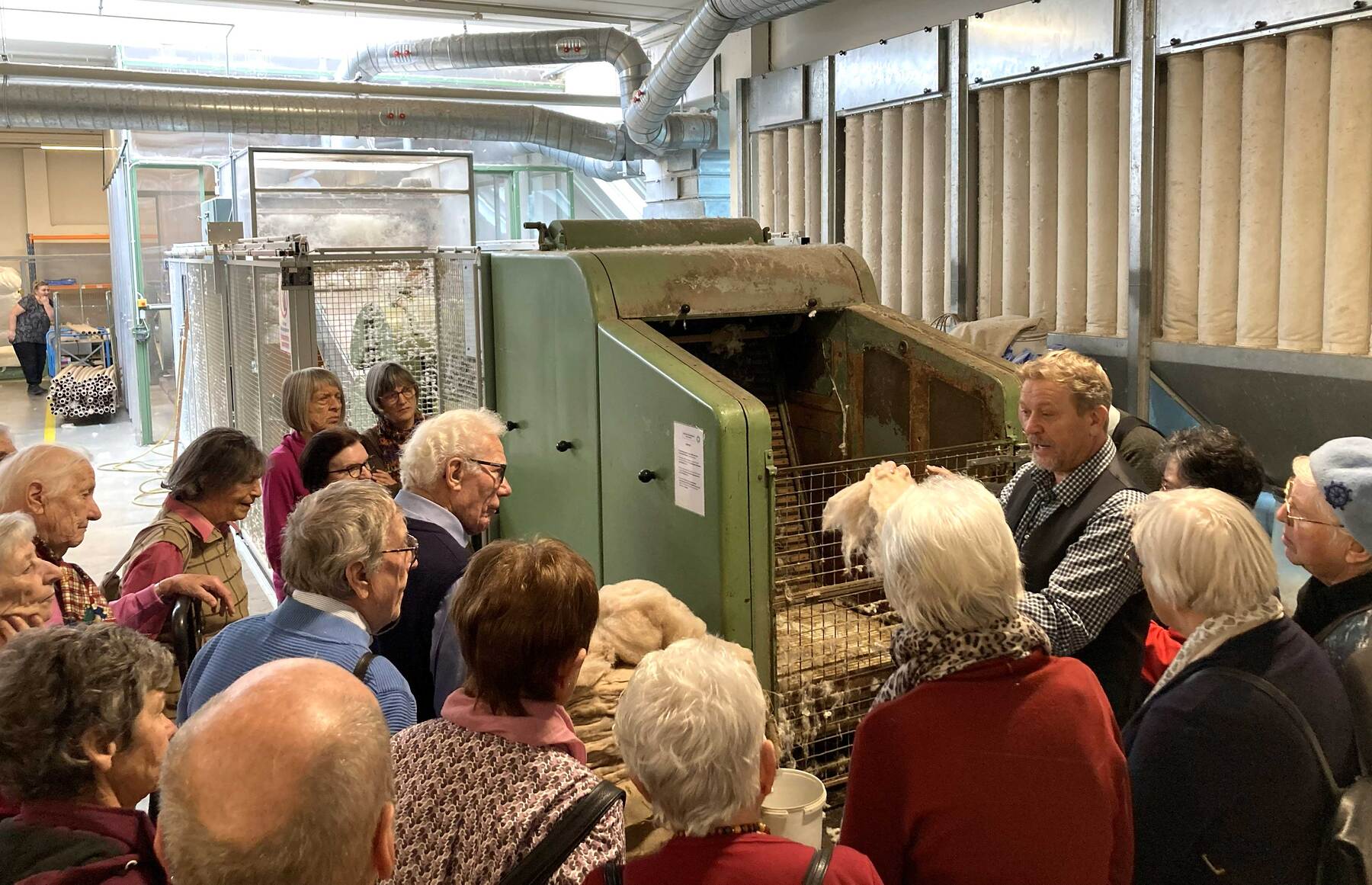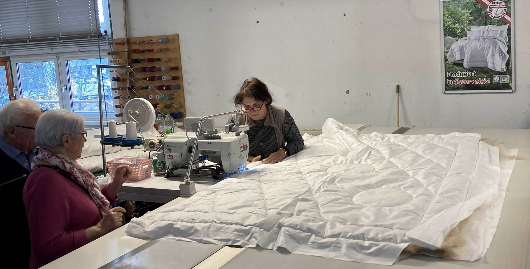 Am Vormittag führte uns der Produktionsleiter der Firma Betten Reiter, Herr Arno Taubner, durch die Decken- und Polsterfertigung. Ausgehend von verschiedenen Rohstoffen, wie Baumwolle, Schaf- oder Kamelwolle, Tencel sowie biologisch abbaubaren Kunstfasern, wird auf einer über 50 Jahre alten Maschine ein Vlies hergestellt. Dieses wird in unterschiedlichen Dicken auf einer großen, computergesteuerten Nähmaschine abgesteppt und anschließend von einer Mitarbeiterin umsäumt.