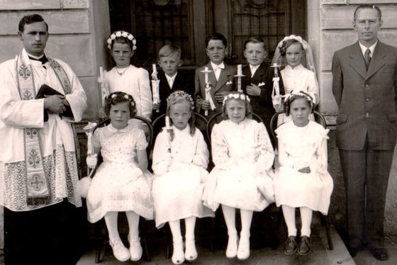 Erstkommunion Pfingstmontag, 30. Mai 1955 Franz Steiner, Leopoldine Selinger, Wilhelm Emathinger, Maria Wagner, Karl Ziegler, Gertraud Kühberger, Rupert Emathinger. Pfarrer Burkhard Bohuslaw und Frau Paula Eiblhuber.