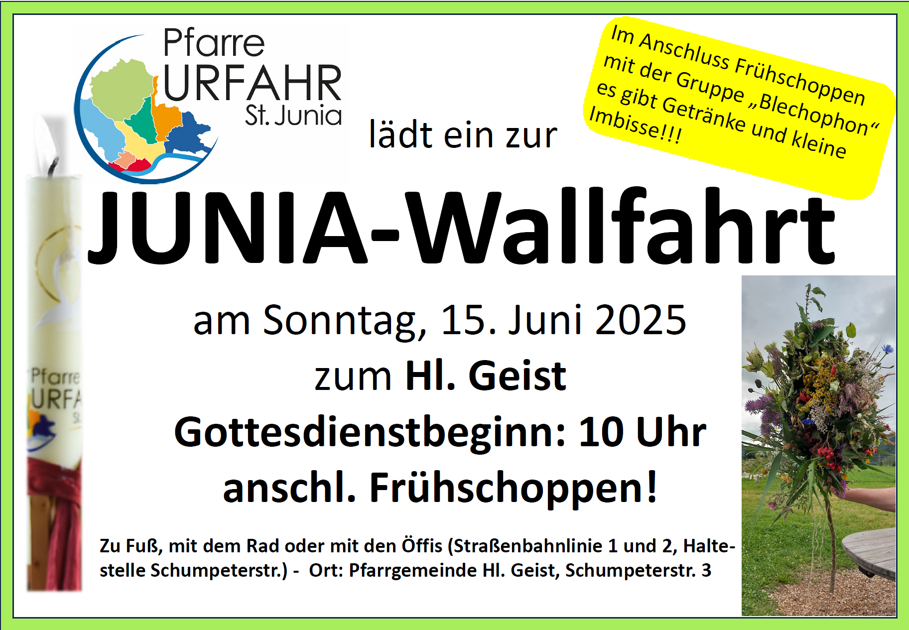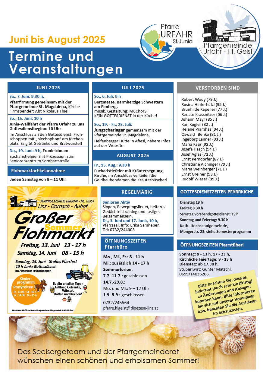 Großer Sommerflohmarkt & Junia Fest Freitag, 13.Juni 13 - 17 Uhr Samstag, 14.Juni 08 - 15 Uhr Sonntag, 15.Juni Großes Junia Pfarrfest (10h Gottesdienst, dann Frühschoppen)