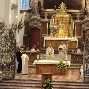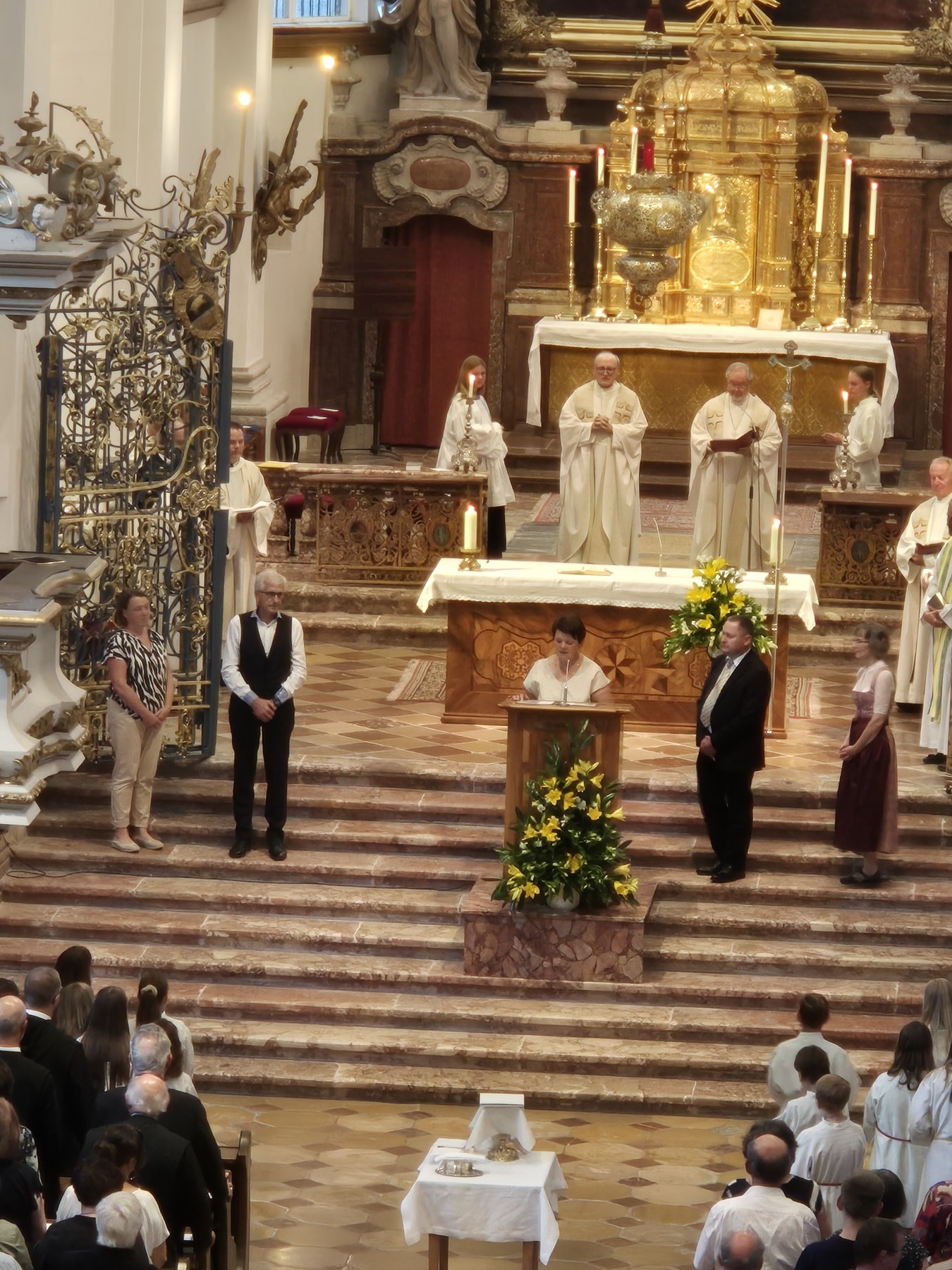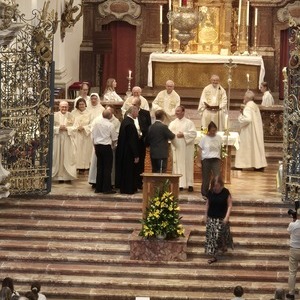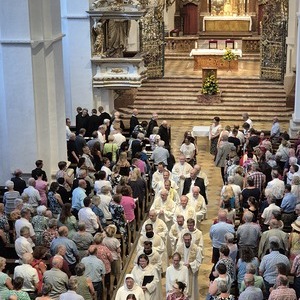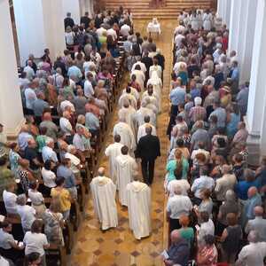Den Festgottesdienst zur Amtseinführung von Pfarrer und Pfarrvorständen feierte Generalvikar Severin Lederhilger gemeinsam mit Priestern und weiteren Seelsorger:innen aus den Pfarrteilgemeinden sowie mit Prior P. Maximilian Bergmayr in Vertretung von Abt Bernhard Eckerstorfer, Abt em. Ambros Ebhart und weiteren Konventmitgliedern am 1. Juli 2025 um 19 Uhr in der Stiftskirche Kremsmünster, die gleichzeitig die Pfarrkirche der neuen Pfarre ist, mit den Gläubigen. Gekommen waren Vertreter:innen aller 16 Pfarrteilgemeinden und der pastoralen Orte und zahlreiche Pfarrmitglieder der neuen Pfarre Tassilo-Kremsmünster. Aus allen 16 Pfarrteilgemeinden feierten Ministrant:innen den Festgottesdienst mit. Auch Bürgermeister:innen aus den Gemeinden des Pfarrgebiets waren unter den Mitfeiernden. Das Miteinander in der neuen Pfarre zeigte sich auch in der musikalischen Gestaltung des Gottesdienstes: Es musizierte ein etwa 80-köpfiger Chor aus Sänger:innen fast aller 16 Pfarrteilgemeinden unter der Leitung von Martin Kaltenbrunner aus Scharnstein.